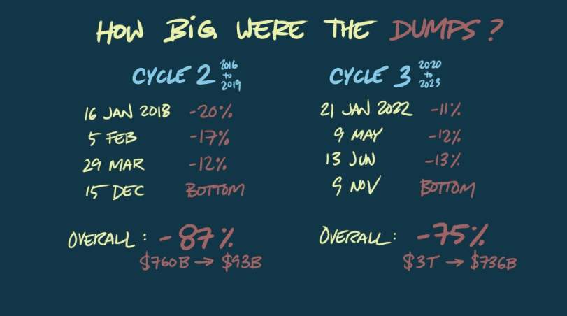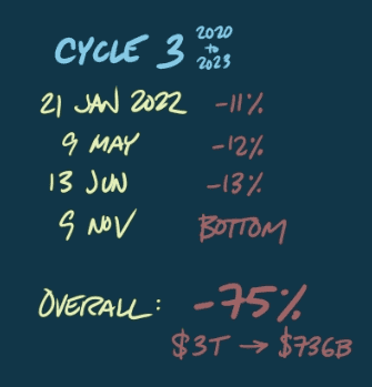 We had a market cap of $760 billion at the top of Cycle 2; by the end of that year, it was under $100 billion. That’s how big the drops are in crypto.