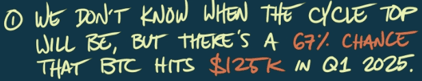 I think there’s still some space. Historically, there’s a 67% chance that Bitcoin will hit $125,000 in Q1. Where does that data come from? We looked at every time Bitcoin’s price increased by at least 50% over a two-month period. This has happened 120 times over the last 13 years. We checked how many times the price continued to go up after that. We found there is a 67% chance it will continue going up by at least 30% more. That’s how we end up at $125,000 in Q1 of 2025.