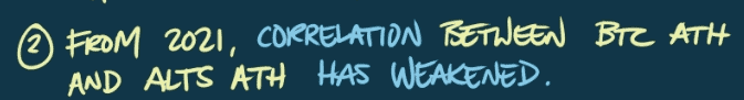 Another key learning is the correlation between Bitcoin’s all-time high and altcoins’ all-time highs has weakened.