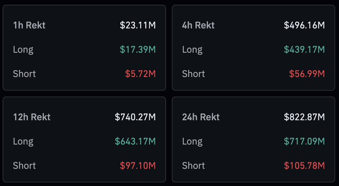 The most recent Coinglass data at the time of publishing: In the past 24 hours, 212,064 traders were liquidated, resulting in total liquidations amounting to $822.87 million.
